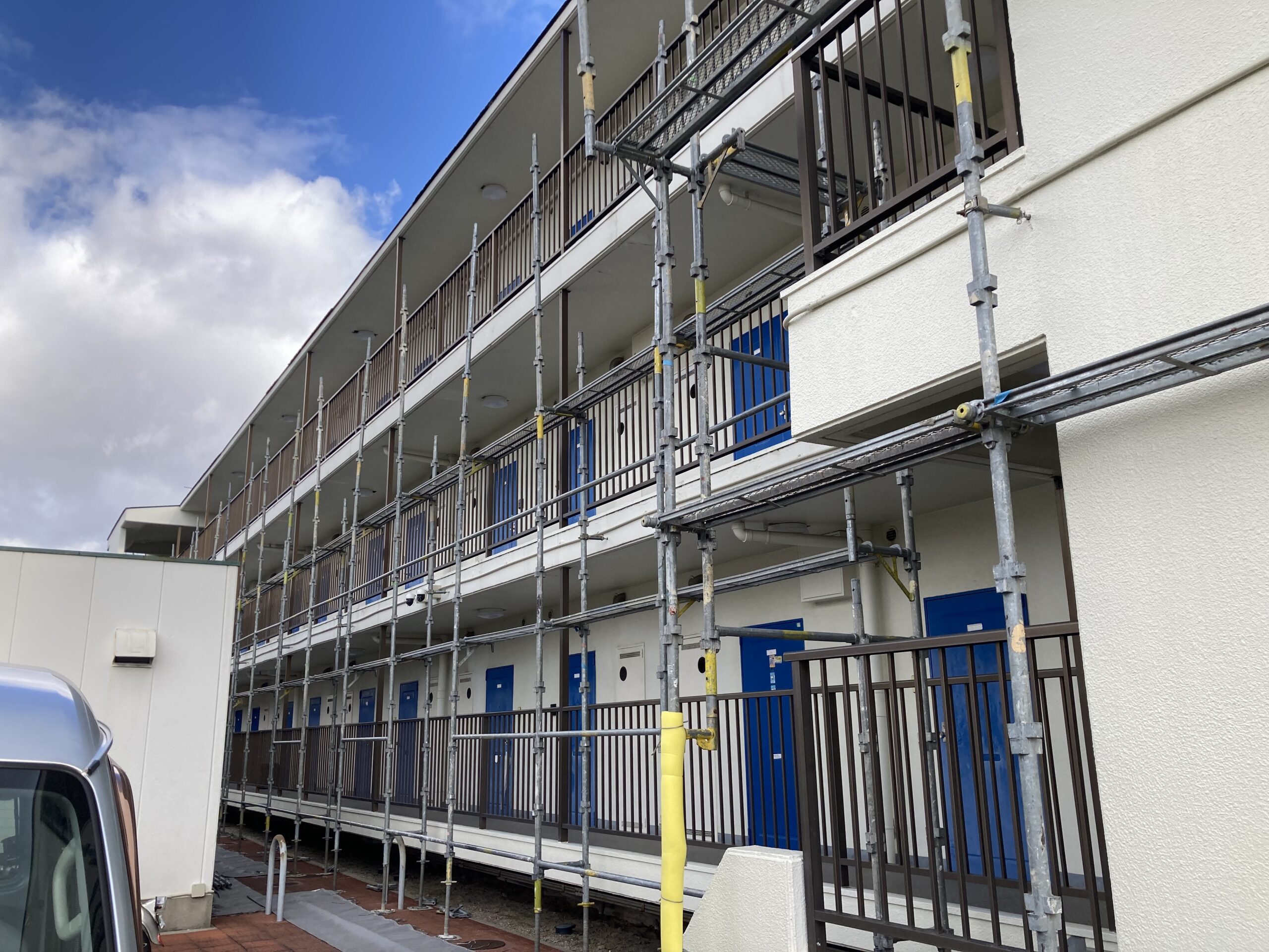 奥行きが長ーい3階建てのマンションです。仮設足場の設置数量は1200㎡程あります☺