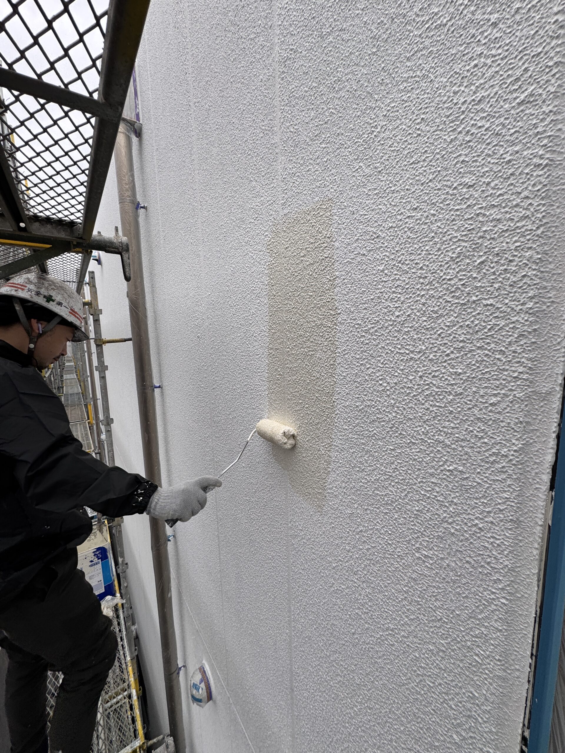 中塗りを施工していきます。こちらの壁面積約500㎡程です。戸建て住宅の3件から5件分程度の面積になります。中塗り作業は2人で心を込めて塗りました(‘ω’)ノ